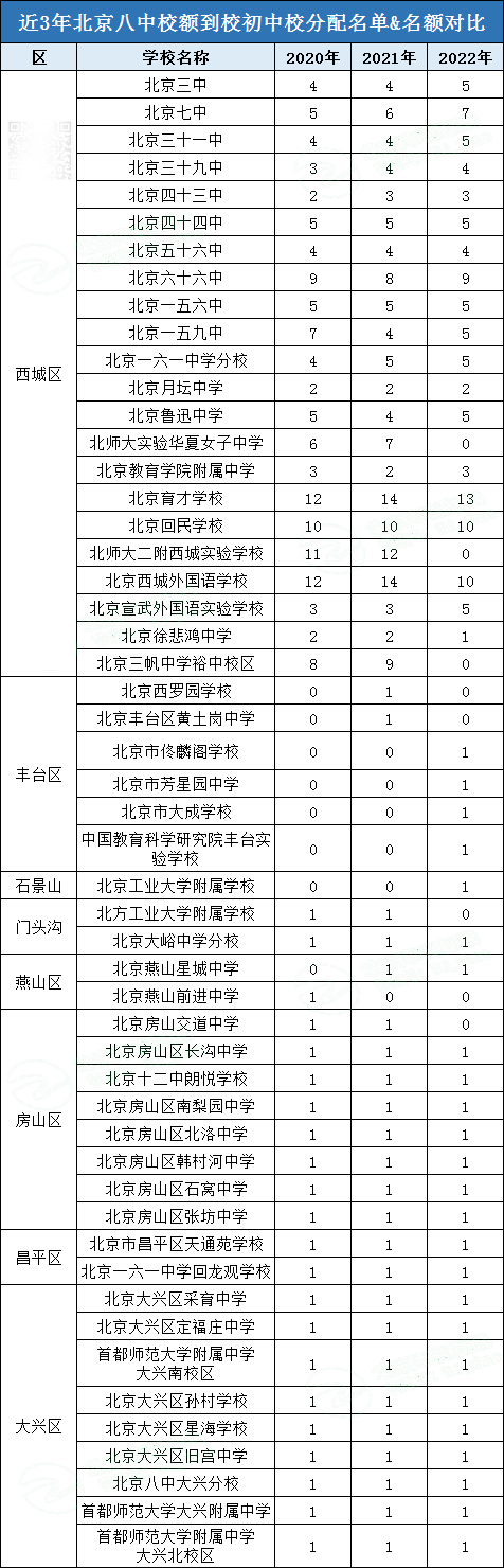 3、2022年北京八中校额到校较2021年名额减少了25人,市级统筹名额不变。下面会为大家详细列举近3年北京八中 校额到校名额分配详情↓↓