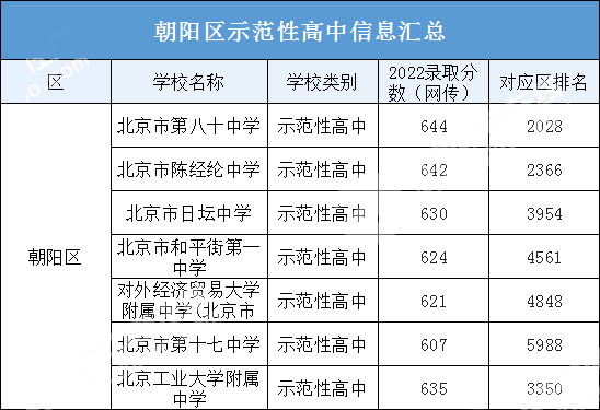 2022年朝阳区示范高中有哪些?各校录取分数线和区排名是多少?!北京admw360教研组整理分享相关信息,供大家参考。