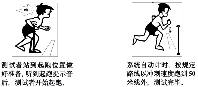 按照操作员提示站到指定位置上,准备完毕后,采用站立式起跑,仔细听主机发令枪声,待仪器发出枪声提示音后开始起跑,学生通过终点后自动读取测试成绩。