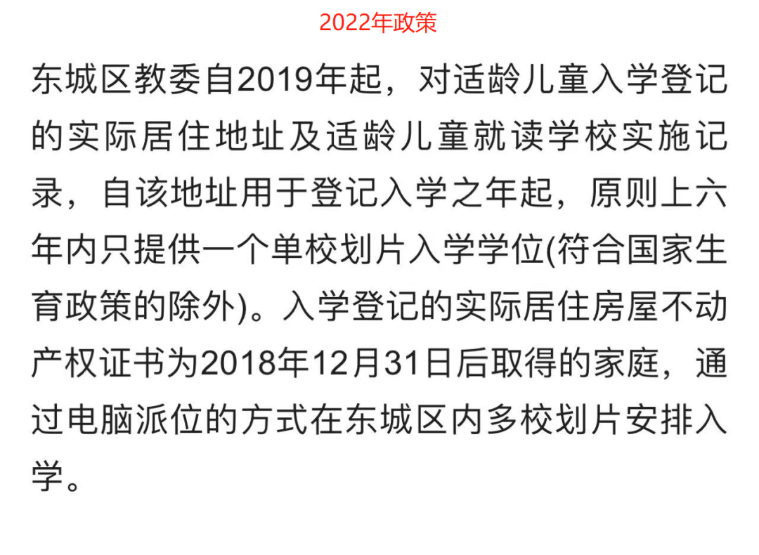 今年文件对往年政策进行了重申:东城区教委自2019年起,对适龄儿童入学登记的实际居住地址及适龄儿童就读学校实施记录,自该地址用于登记入学之年起,原则上六年内只提供一个单校划片入学学位(符合国家生育政策的除外)。