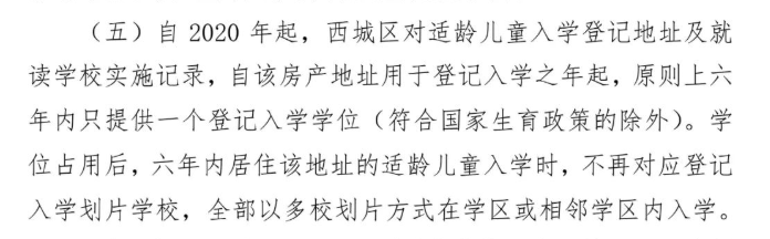 今年西城区对“六年一学位政策”和去年无明显变化,即自2020年起,西城区对适龄儿童入学登记地址及就读学校实施记录,自该房产地址用于登记入学之年起,原则上六年内只提供一个登记入学学位(符合国家生育政策的除外)。学位占用后,六年内居住该地址的适龄儿童入学时,不再对应登记入学划片学校,全部以多校划片方式在学区或相邻学区内入学。