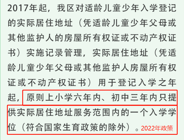 继续对适龄儿童少年入学房产地址及就读学校实施记录,对入学使用的房产地址实行“学位限定”,即自登记入学之年起,原则上小学6年内、初中3年内只提供一个实际居住地址服务范围内的入学学位(符合国家生育政策的除外)。该房址如再有入学需求,以多校划片方式协调解决。