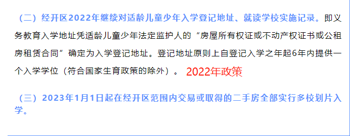 经开区2022年继续对适龄儿童少年入学登记地址、就读学校实施记录。即义务教育入学地址凭适龄儿童少年法定监护人的“房屋所有权证或不动产权证书或公租房租赁合同”确定为入学登记地址。登记地址原则上自登记入学之年起6年内提供一个入学学位(符合国家生育政策的除外)。