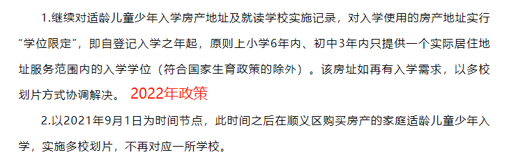 通州区2022年继续实施“六年一学位”政策,从2018年开始,区教委规定用于小学入学的住房自登记入学之年起,原则上6年内只提供一个学位(符合国家生育政策的除外)。