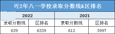2、从近2年八一学校中考录取分数线对应区排名可以看出,八一学校2022年中考区排名相较2021年下降了2342名,可能与八一学校 2022年招生计划增加等有关。后期考生想要报考八一学校的考生不仅要关注自己的成绩,更要关注自己的区排名。