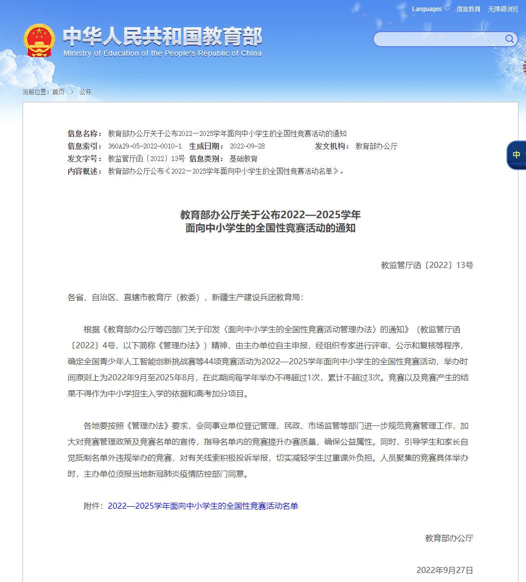 教育部公布了2022-2025学年面向中小学生的全国性竞赛活动名单,共有“全国青少年人工智能创新挑战赛”等44项竞赛进入名单。详细名单信息,赶紧来看!