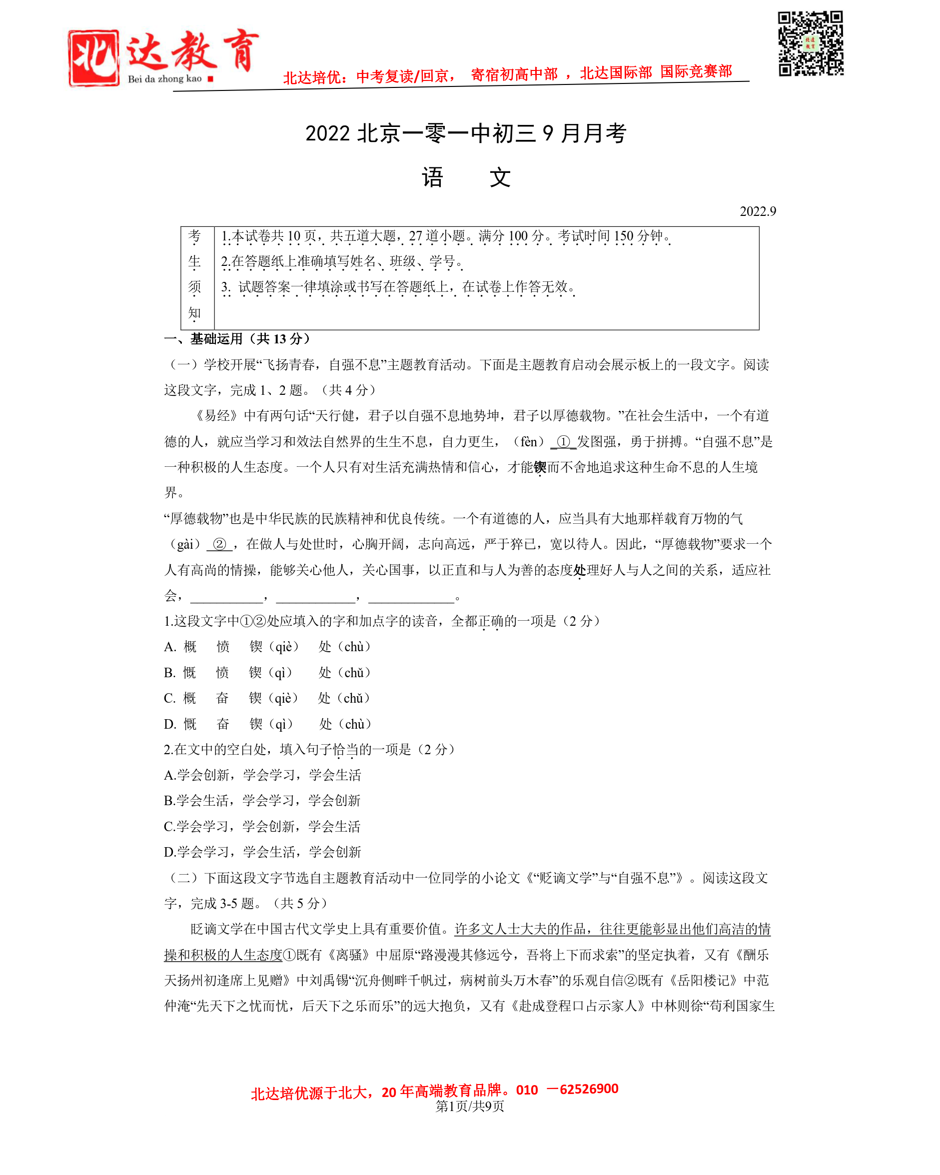 首页 初三试题 2022北京一零一中初三9月月考语文试卷