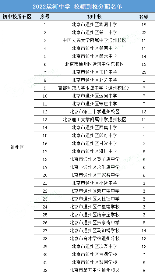 2022年潞河中学有280个校额到校名额,分给了通州32所学校。详细分配名额见上表↑↑