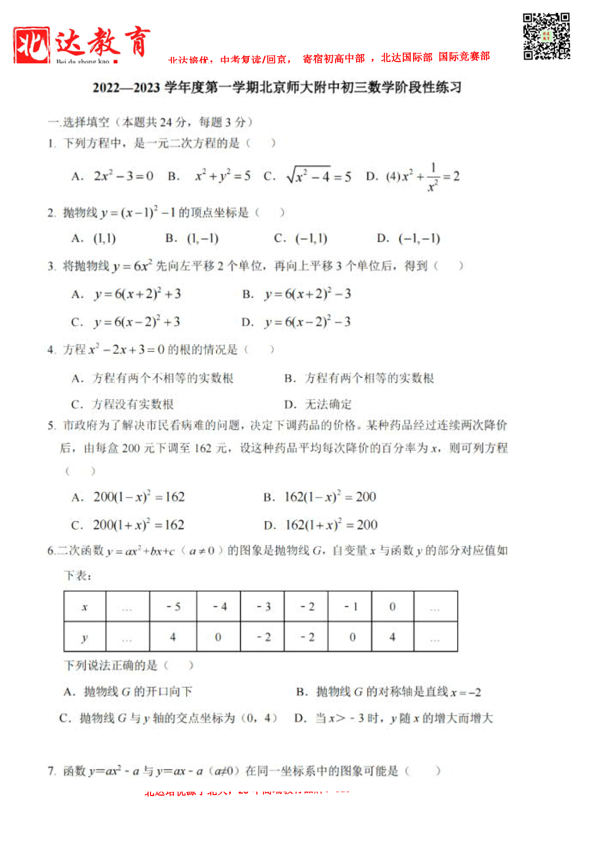 admw360教研组为大家整理了2022-2023学年北师大附中初三(上)数学阶段性练习,分享给大家。赶紧下载练起来吧。
