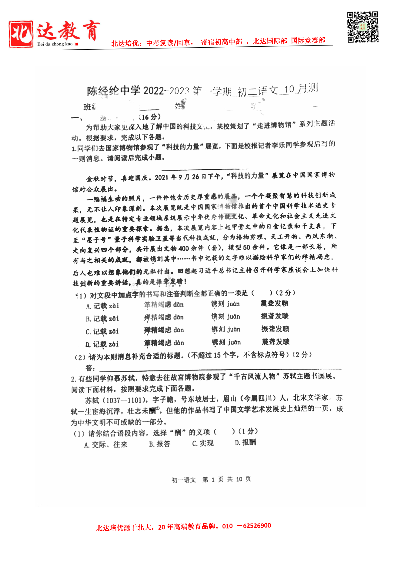 admw360教研组为大家整理了陈经纶中学2022-2023学年初二10月月考语文试卷,享给大家。赶紧下载练起来吧。
