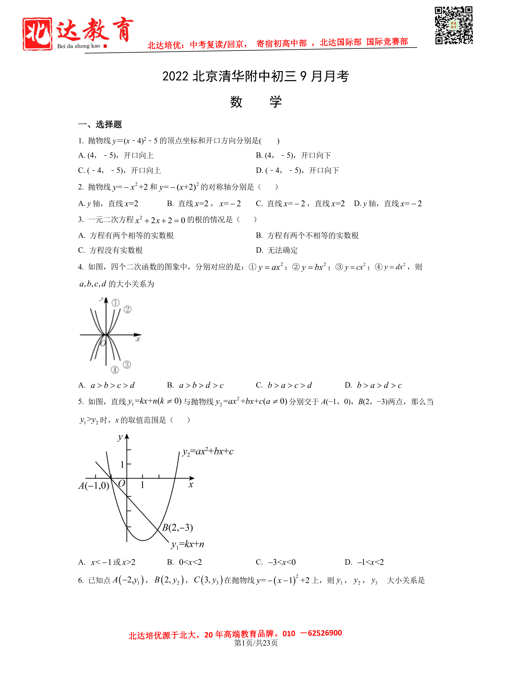 admw360教研组为大家整理了2022北京清华附中初三数学九月月考试题,分享给大家。赶紧下载练起来吧。