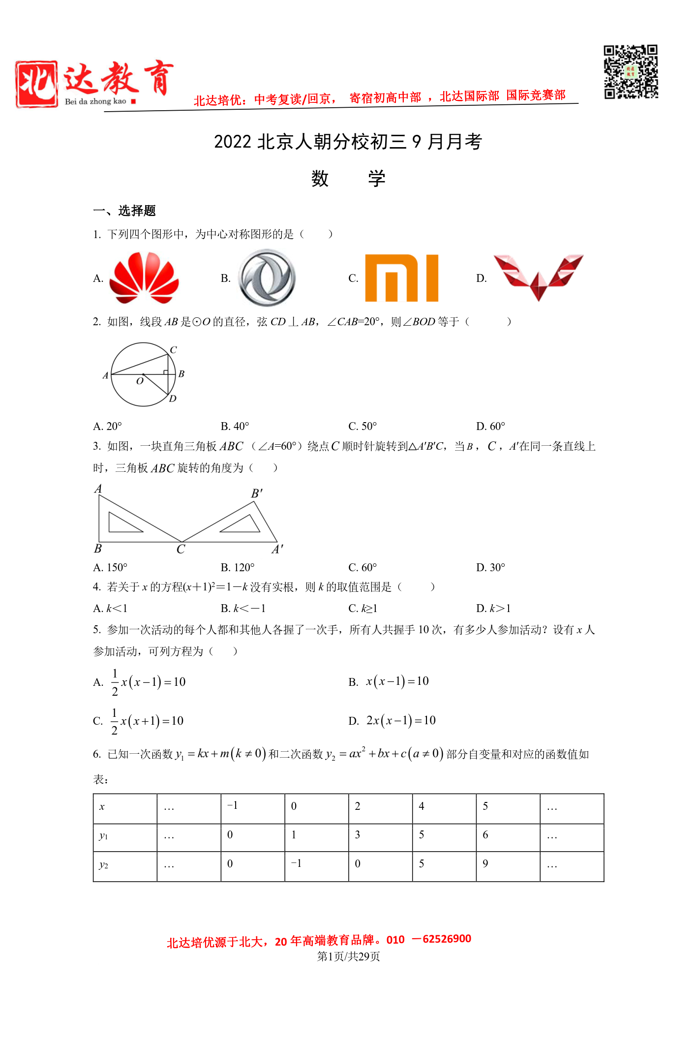 admw360教研组为大家整理了2022北京人朝分校初三数学九月月考试题(含答案),分享给大家。赶紧下载练起来吧。