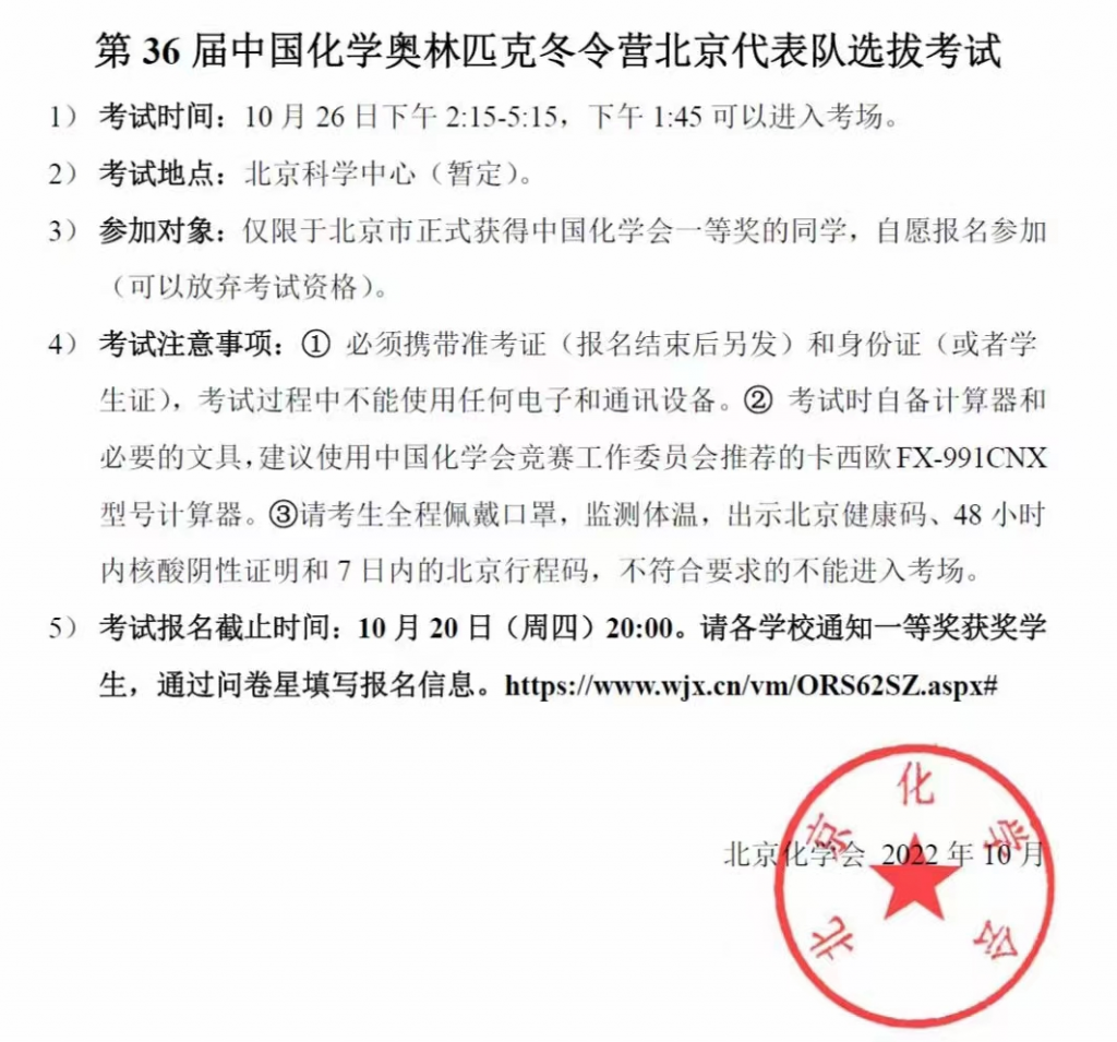 北京化学会发布了关于第36届化学竞赛决赛省队选拔考试通知,通知原文如下: