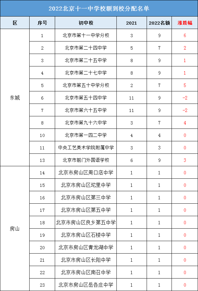 2、北京十一中统招计划2022年较2021年增加了22人,这可能是北京十一中区排名下降的原因之一。再来看一下近2年北京十一中校额到校分配名额的对比情况↓↓