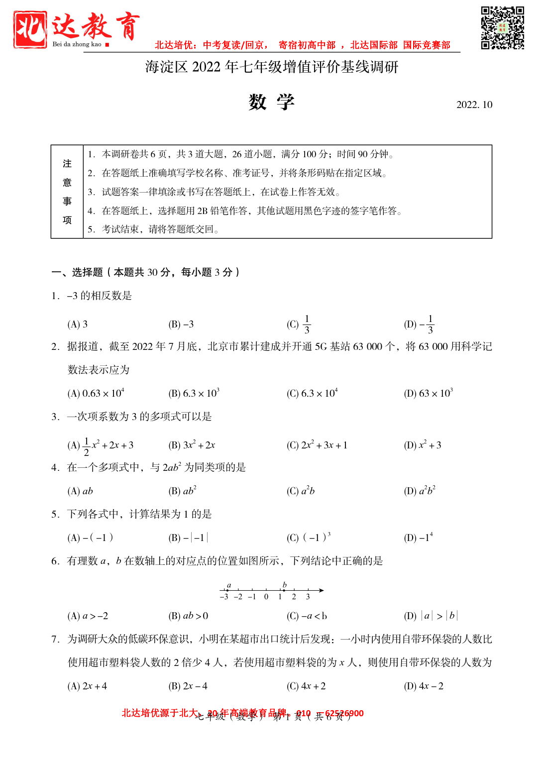 2022年北京海淀区初一(上)数学期中考试已开始,admw360中考网第一时间为大家整理了试卷,分享给各位小伙伴。