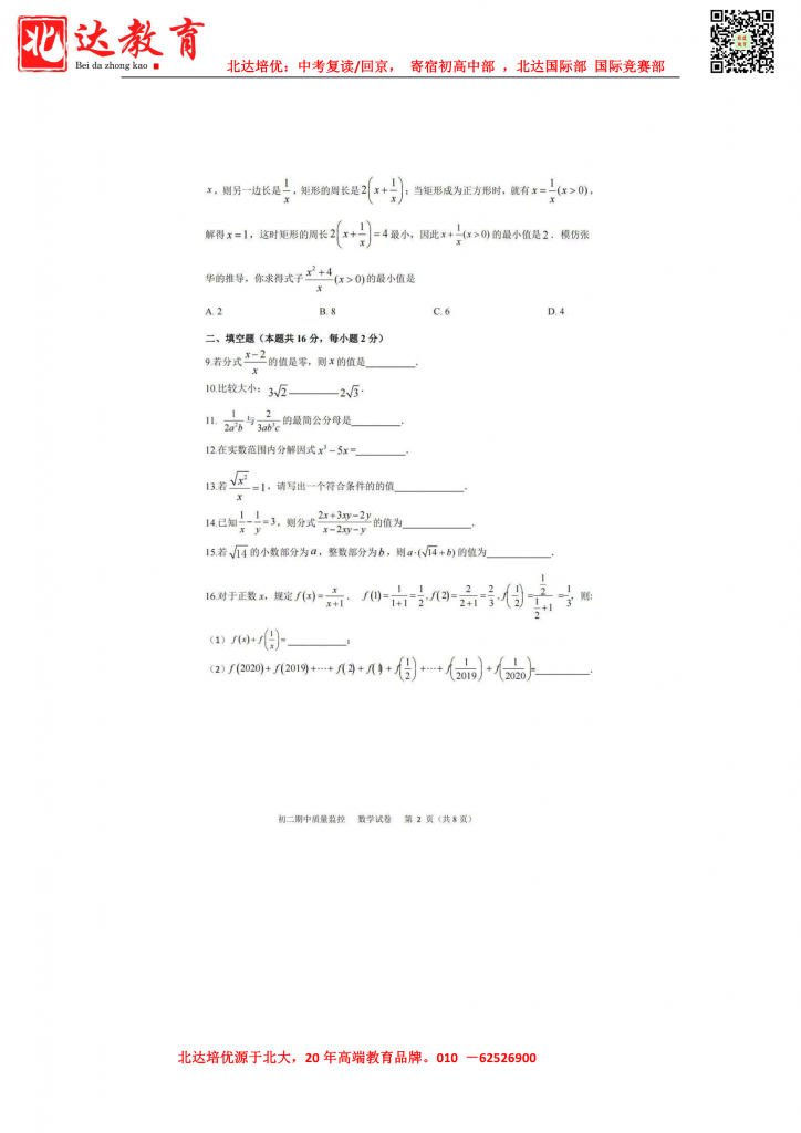 2021北京名校初二下期中试题及答案汇总