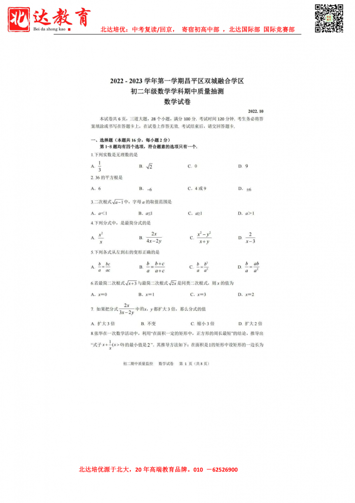 相关阅读:北京名区2022-2023学年初二(上)期中考试试题及答案汇总