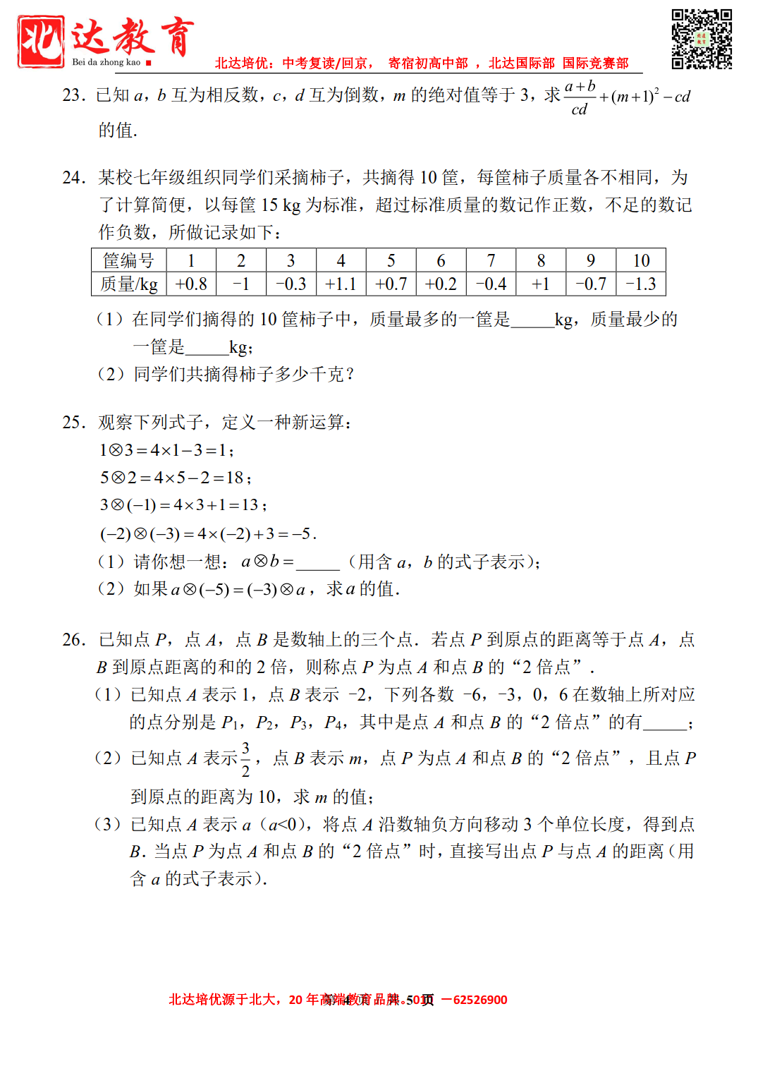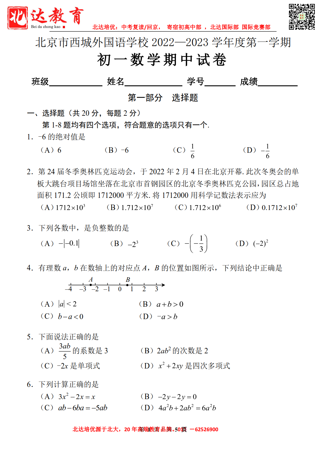 2022-2023学年西城外国语学校初一(上)数学期中试题