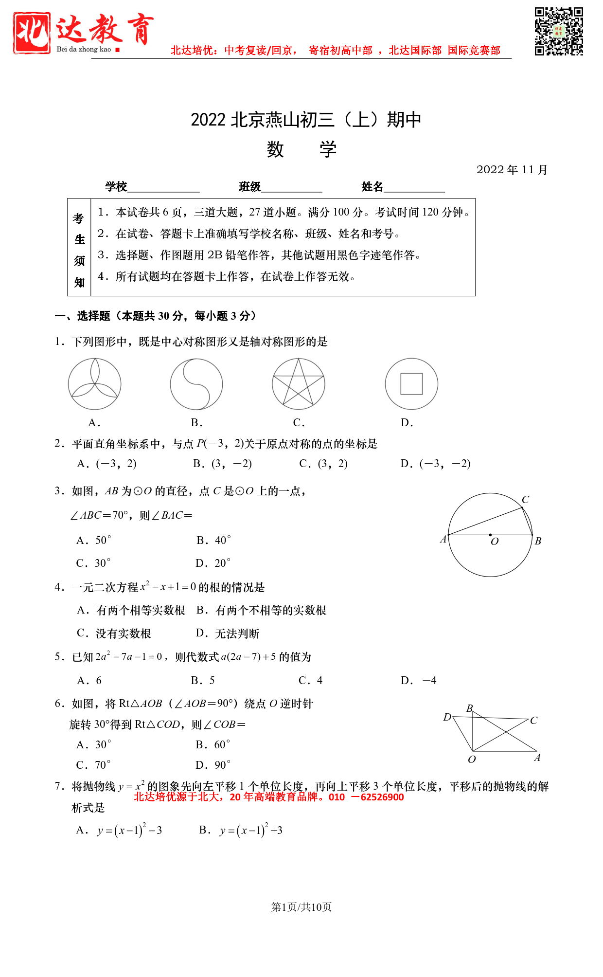 今天,admw360中考网为大家整理了2022-2023学年北京燕山初三(上)期中数学试题含答案,分享给大家。赶紧下载练习起来吧。