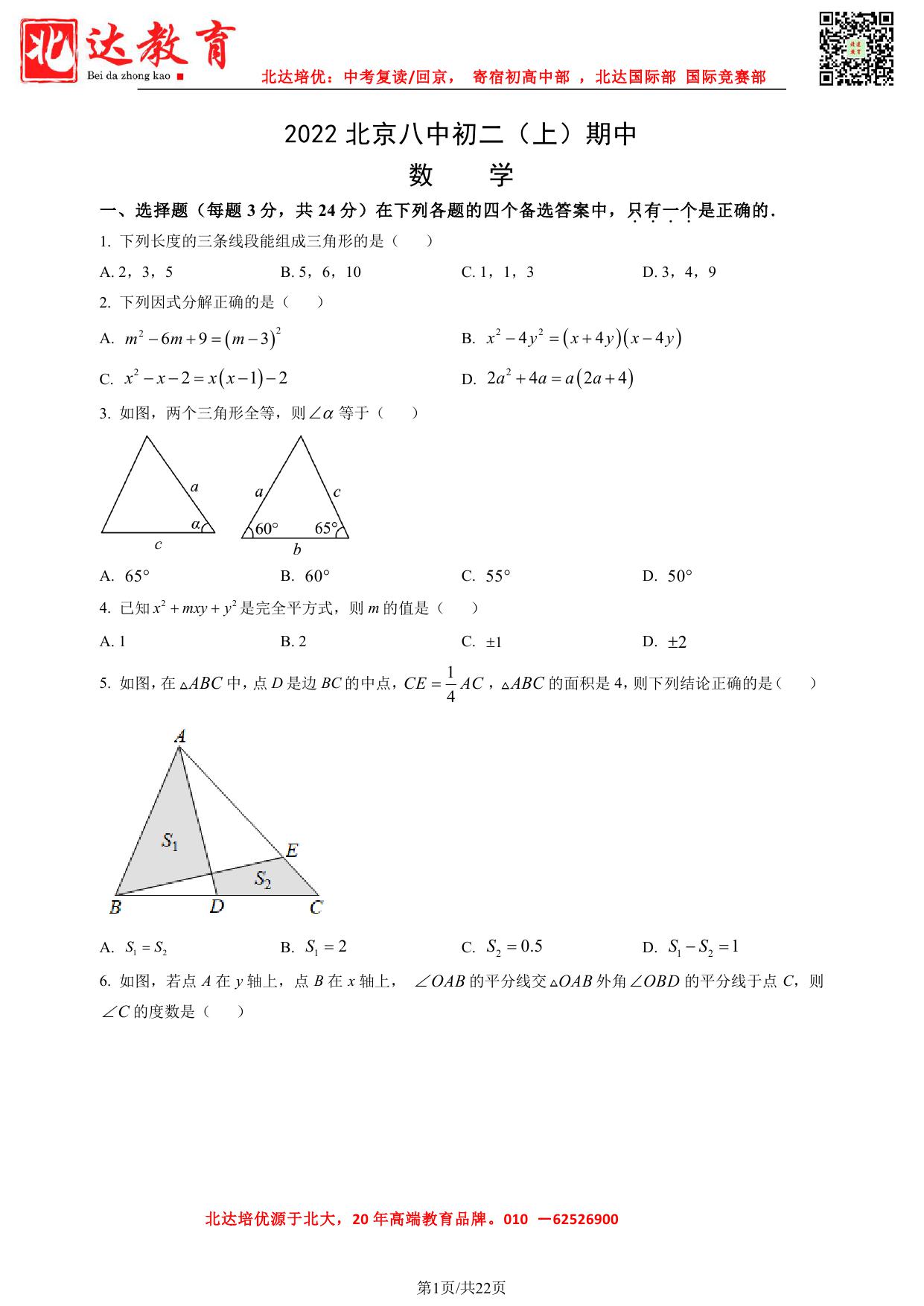 今天,admw360中考网为大家整理了2022-2023学年北京八中初二(上)期中数学试试卷及答案,分享给大家。赶紧下载练习起来吧。