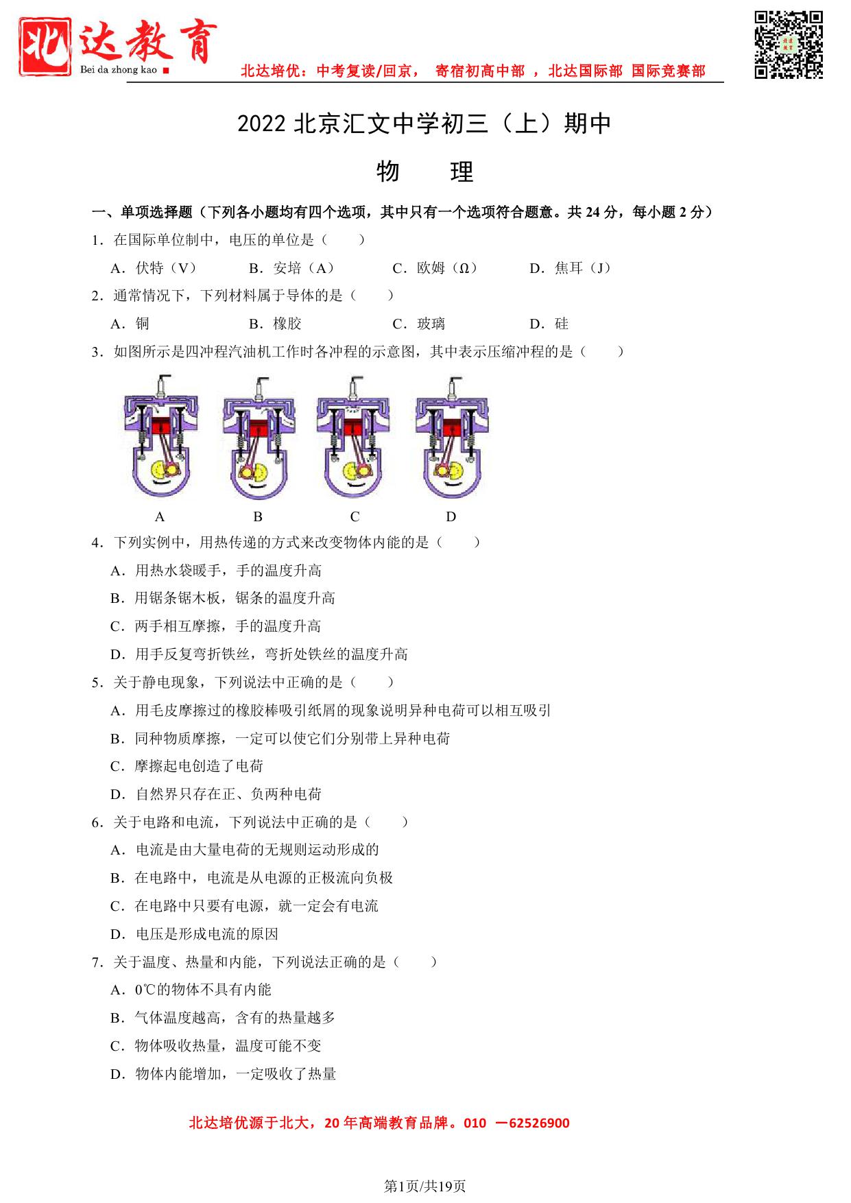 今天,admw360中考网为大家整理了2022-2023学年北京汇文中学初三(上)期中物理试试卷及答案,分享给大家。赶紧下载练习起来吧。