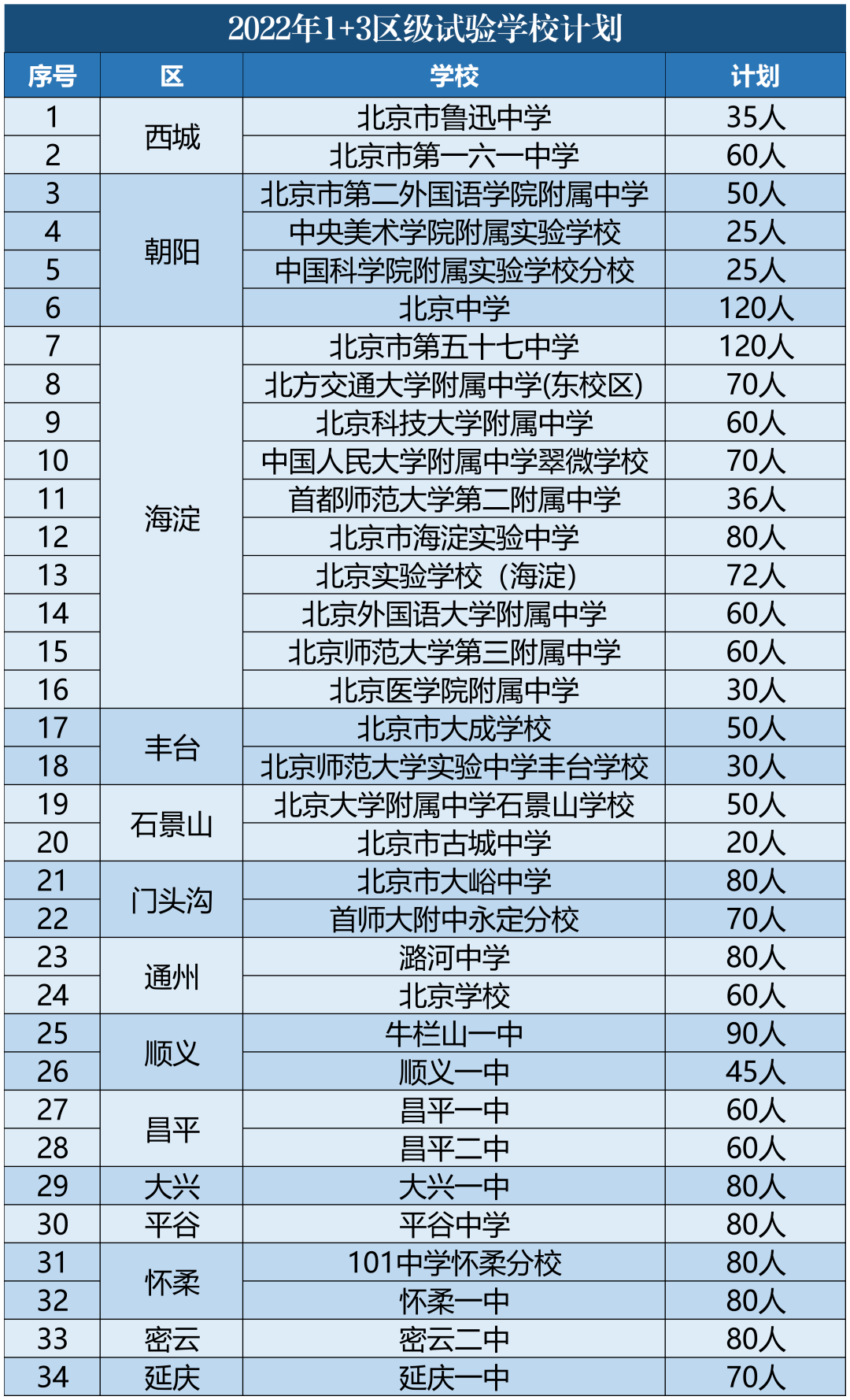 2022年1+3区级试验学校计划根据2022年1+3项目数据显示,2022年市级试验学校共有7所,其中不乏清华附中、北大附中、人大附中等知名中学分校。在区级试验学校方面,海淀区1+3项目参与学校共计10所,计划招生人数也为所有区中最多。