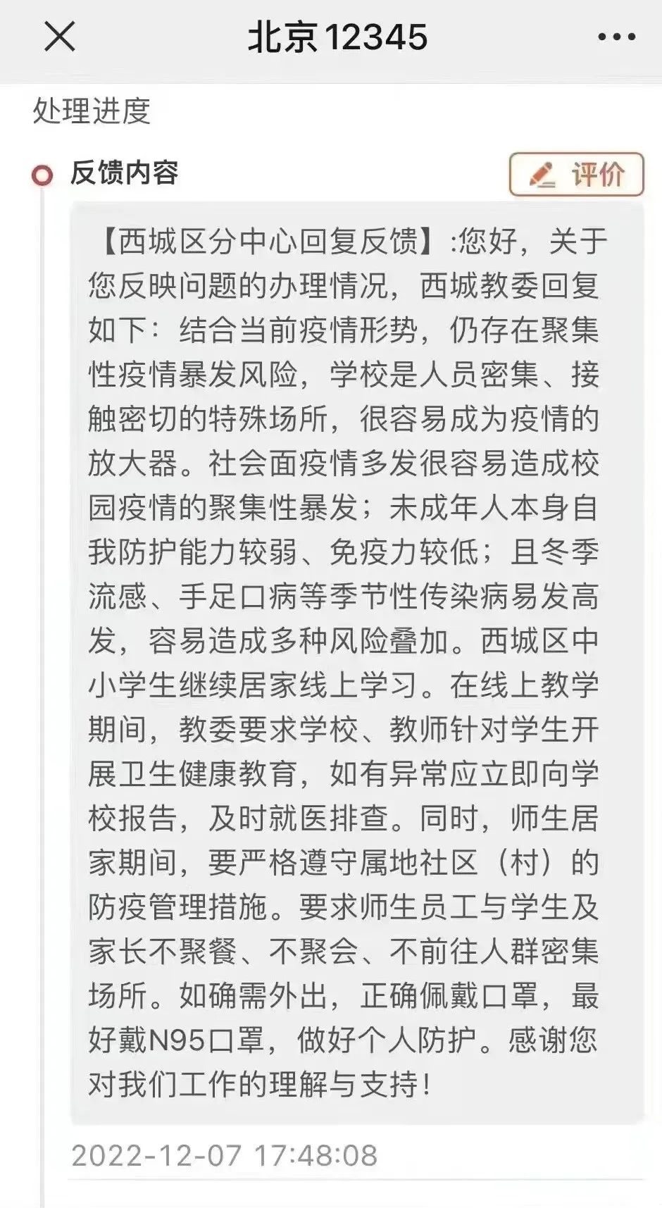 近日,有家长在12345咨询关于北京西城区返校复课问题,西城教委答复: