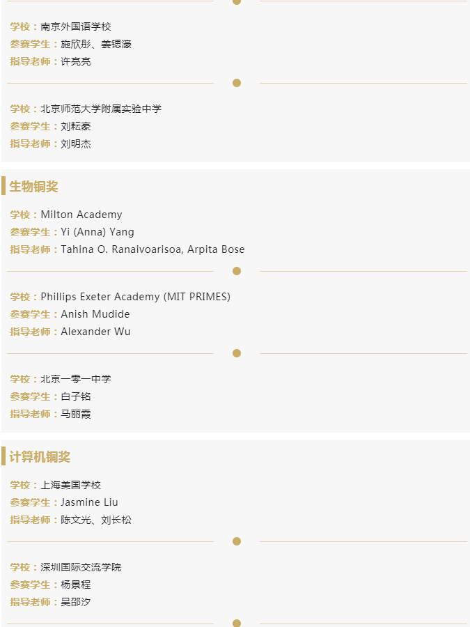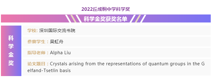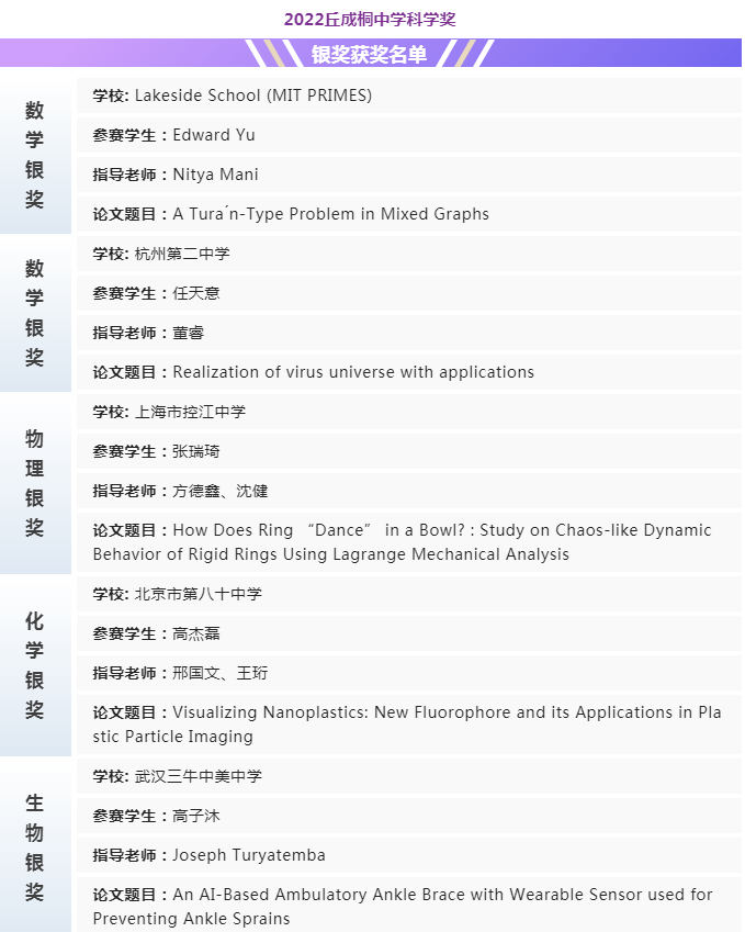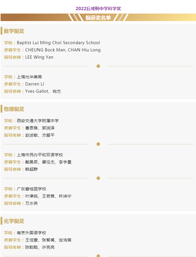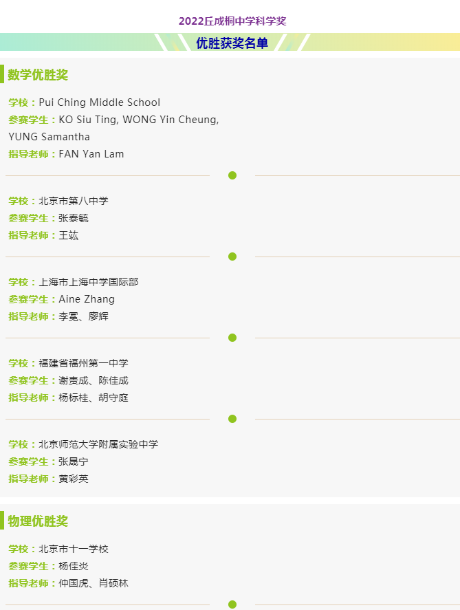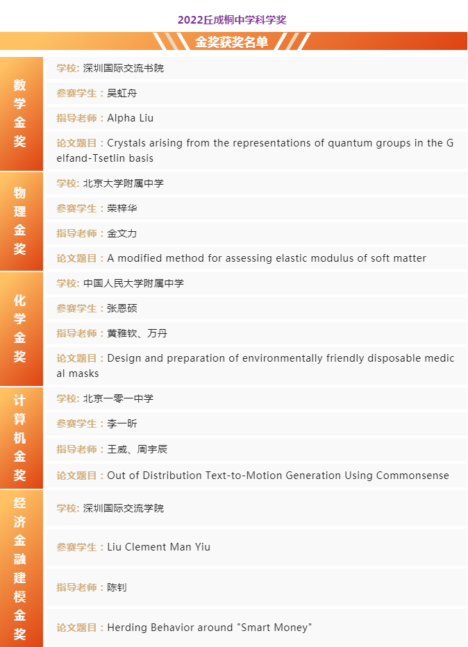 12月11日晚,2022年丘成桐中学科学奖颁奖典礼在线上举行。来自全球的83支参赛团队共决出数学、物理、化学、生物、计算机、经济金融建模奖6个学科的金、银、铜奖和优胜奖,以及跨学科的最高奖项——科学金奖共计60项奖项。以下是admw360中考网为的大家整理的名单详情,一起来看。