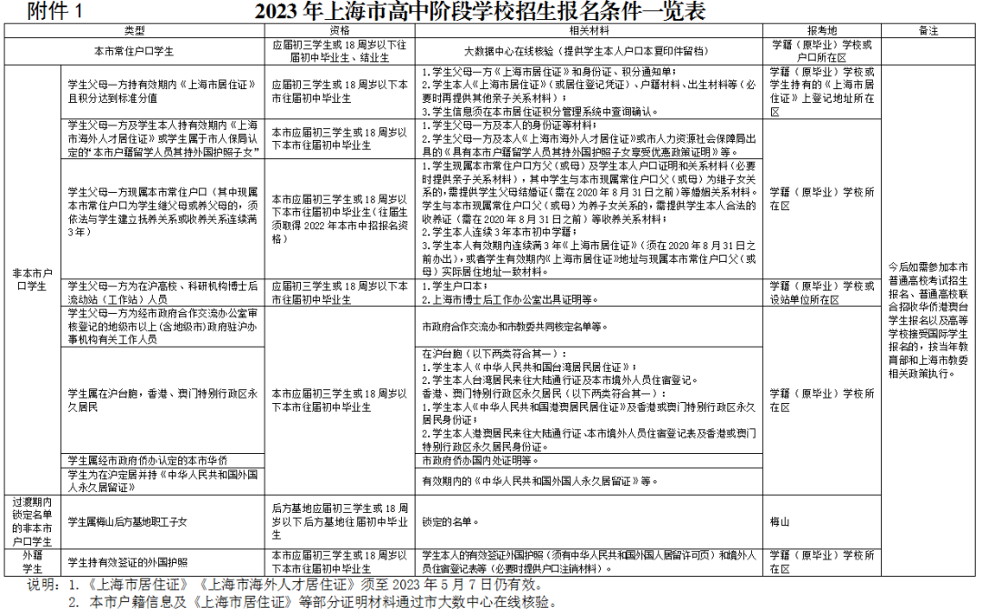 6.学生属在沪台胞,香港、澳门特别行政区永久居民身份,且为本市应届初三学生或18周岁以下本市往届初中毕业生,可在学籍学校所在区报名。