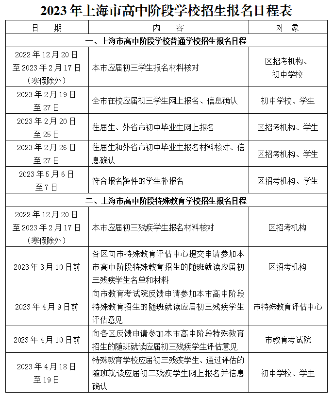 已完成中招报名的本市随班就读应届初三残疾学生,确有意向报考本市高中阶段特殊教育学校的,须于2023年3月10日前向所在学校提出申请,由各区招考机构核准汇总后提交市特殊教育评估中心,市特殊教育评估中心完成评估后于2023年4月10日前将评估结果反馈各区招考机构。