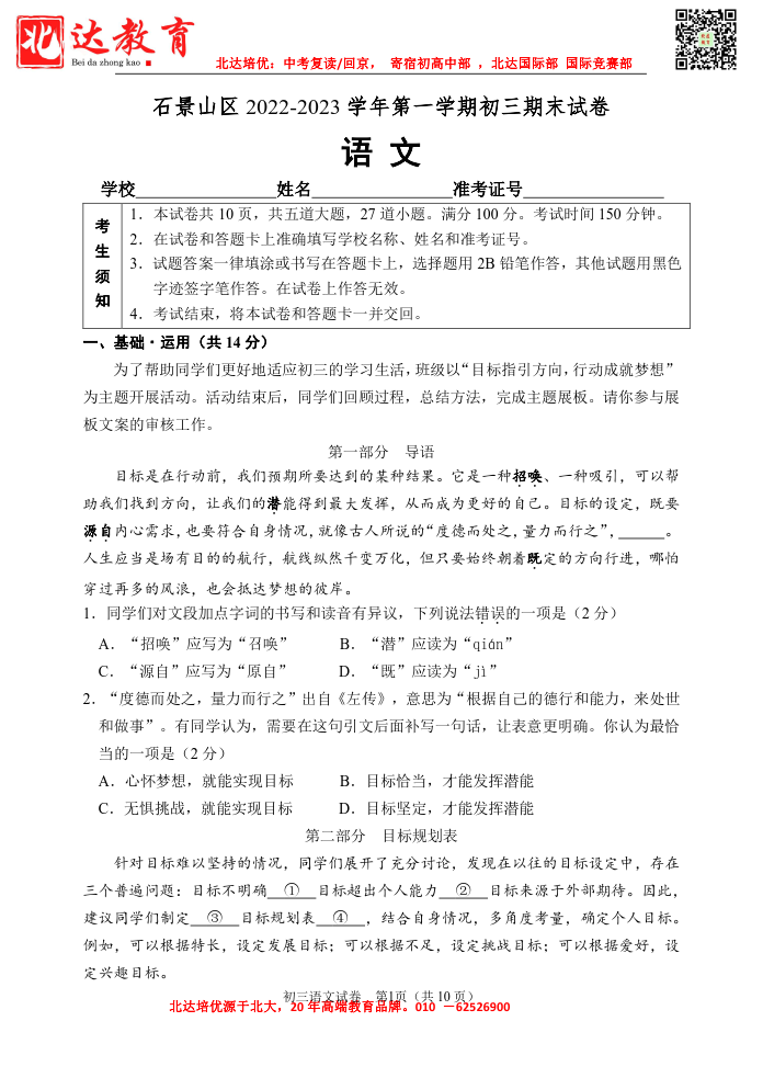 2022-2023学年北京石景山区初三上语文期末考试已结束,admw360中考网第一时间 为大家整理了相关试题,分享给大家。