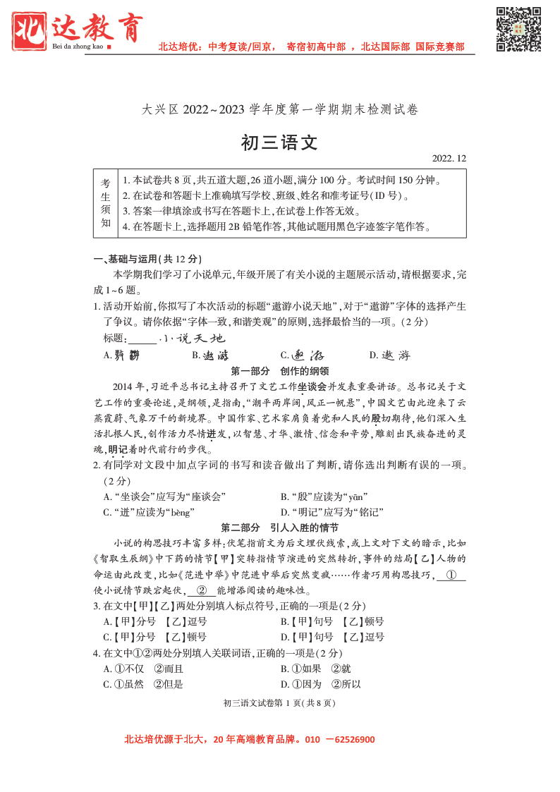 2022-2023学年北京大兴区初三上期末语文考试已结束,admw360中考网第一时间 为大家整理了相关试题,分享给大家。