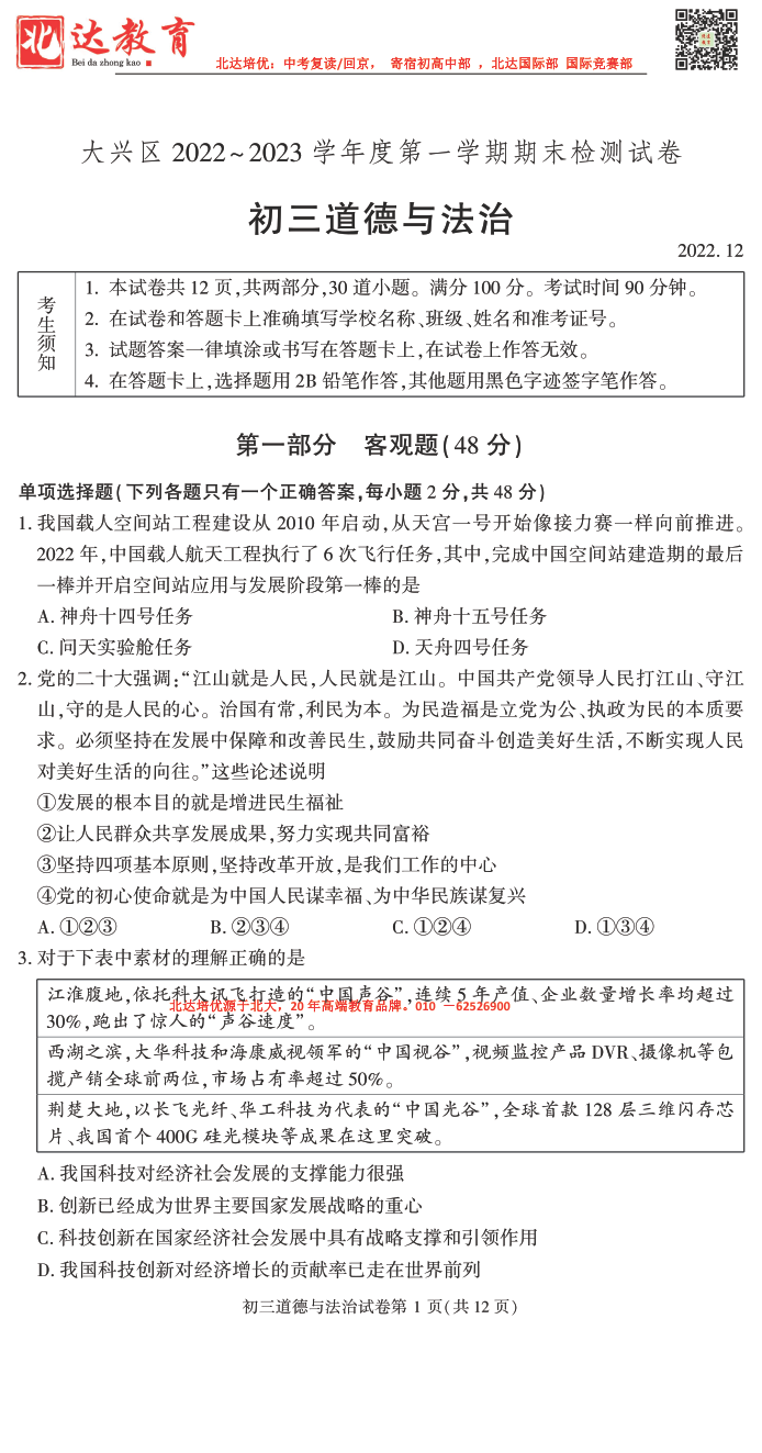 2022-2023学年北京大兴区初三上道德与法治期末考试已结束,admw360中考网第一时间 为大家整理了相关试题,分享给大家。