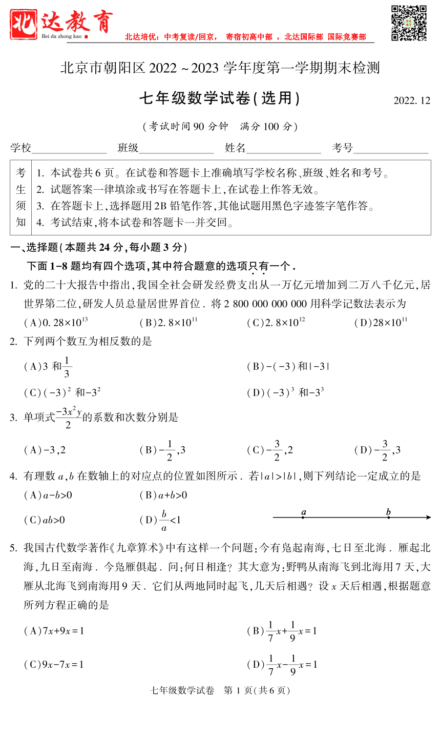 2022-2023学年北京朝阳区初一上数学期末考试已结束,admw360中考网第一时间 为大家整理了相关试题,分享给大家。