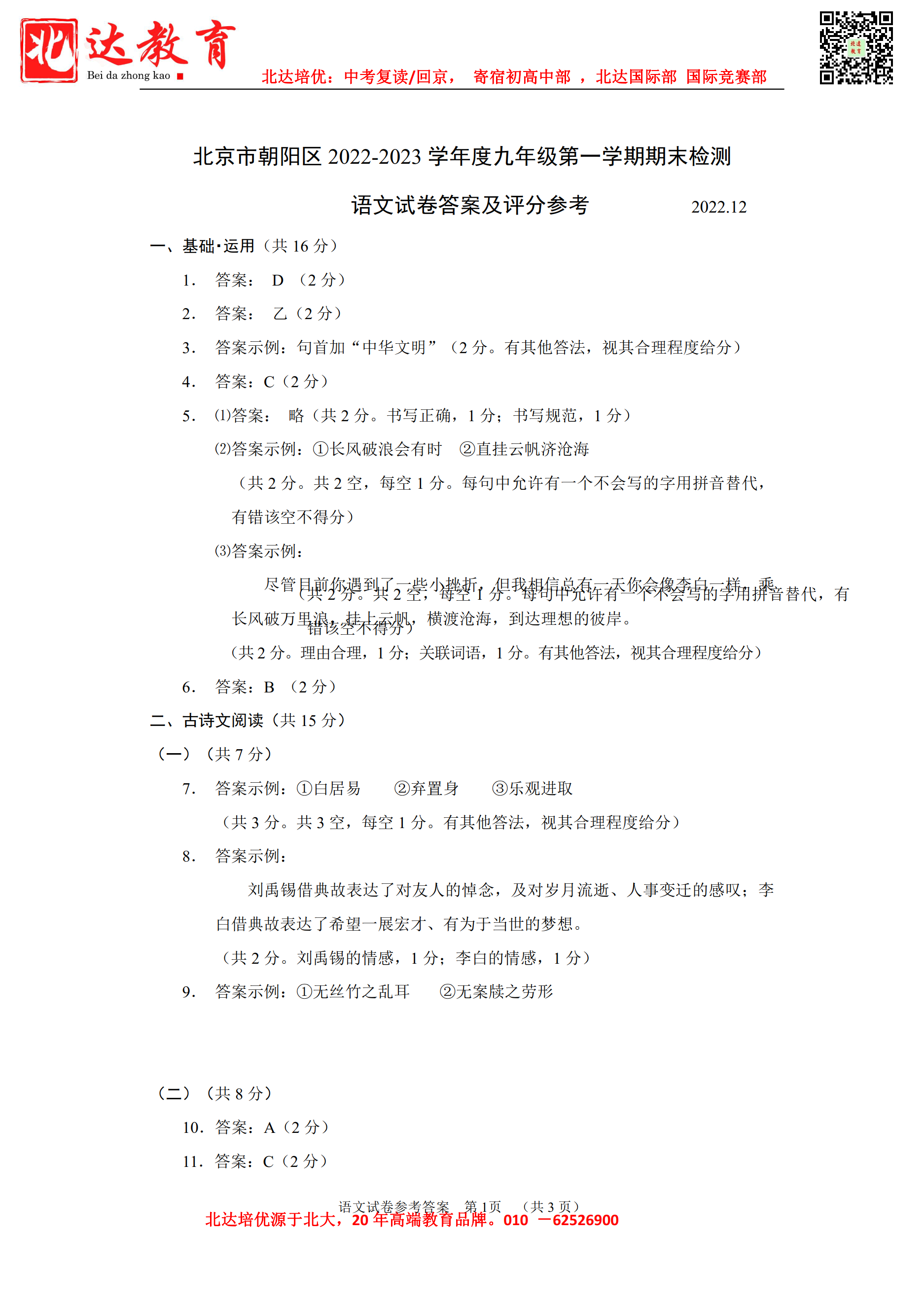 2022-2023学年北京朝阳区初三上语文期末考试已结束,admw360中考网第一时间 为大家整理了相关试题答案,分享给大家。