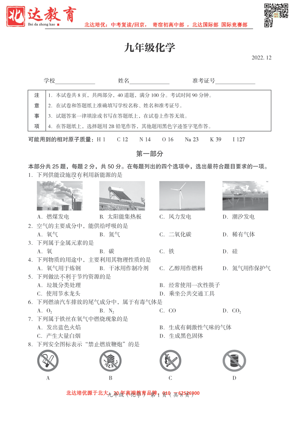 2022-2023学年北京海淀区初三上期末化学考试已结束,admw360中考网第一时间 为大家整理了相关试题,分享给大家。