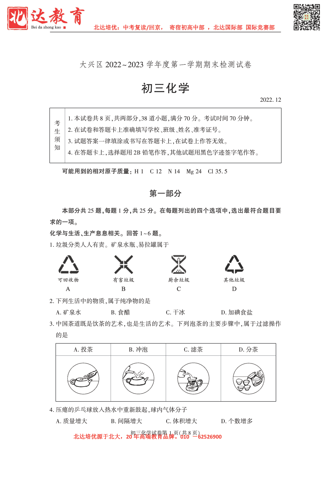 2022-2023学年北京大兴区初三上期末化学考试已结束,admw360中考网第一时间 为大家整理了相关试题,分享给大家。