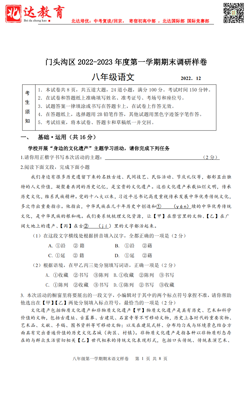 2022-2023学年北京门头沟区初二上期末语文考试已结束,admw360中考网第一时间 为大家整理了相关试题,分享给大家。