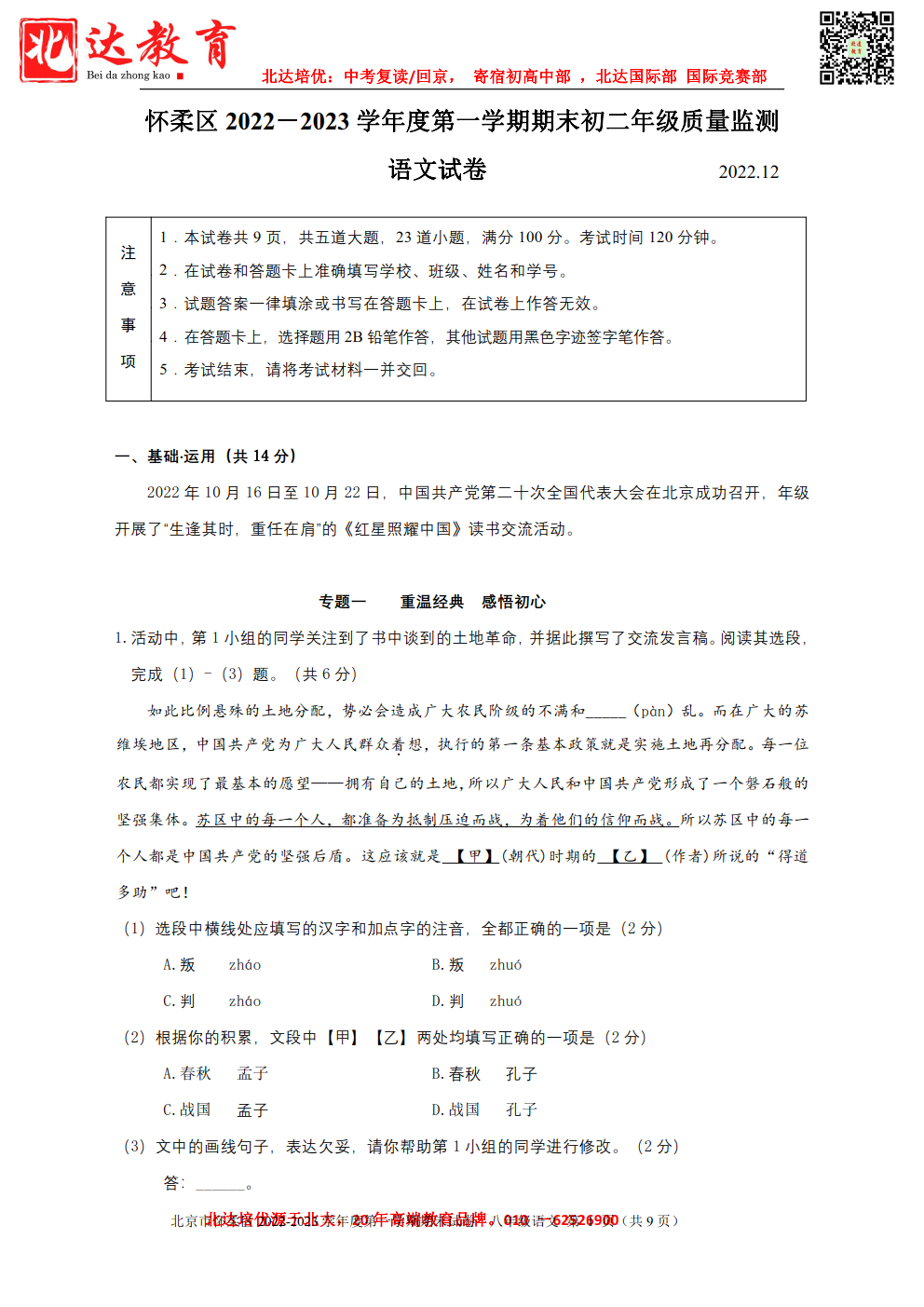 2022-2023学年北京怀柔区初二上期末语文考试已结束,admw360中考网第一时间 为大家整理了相关试题,分享给大家。