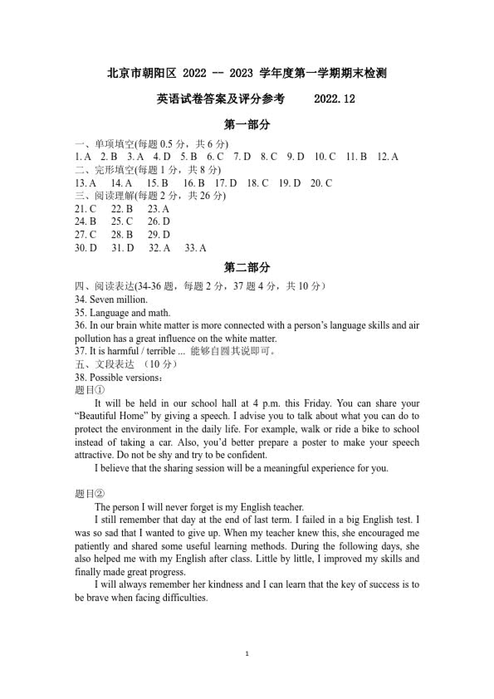 2022-2023学年北京朝阳区初三上期末英语试题及答案