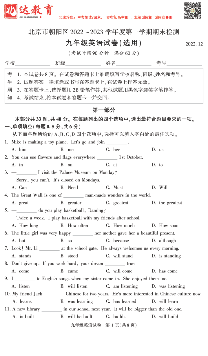 首页 初三试题 2022-2023学年北京朝阳区初三上期末英语试题及答案