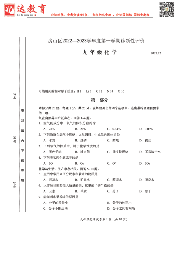 2022-2023学年北京房山区初三上期末化学考试已结束,admw360中考网第一时间 为大家整理了相关试题及答案,分享给大家。