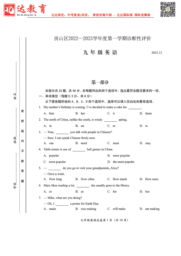 首页 初三试题 2022-2023学年北京房山区初三上期末英语试题