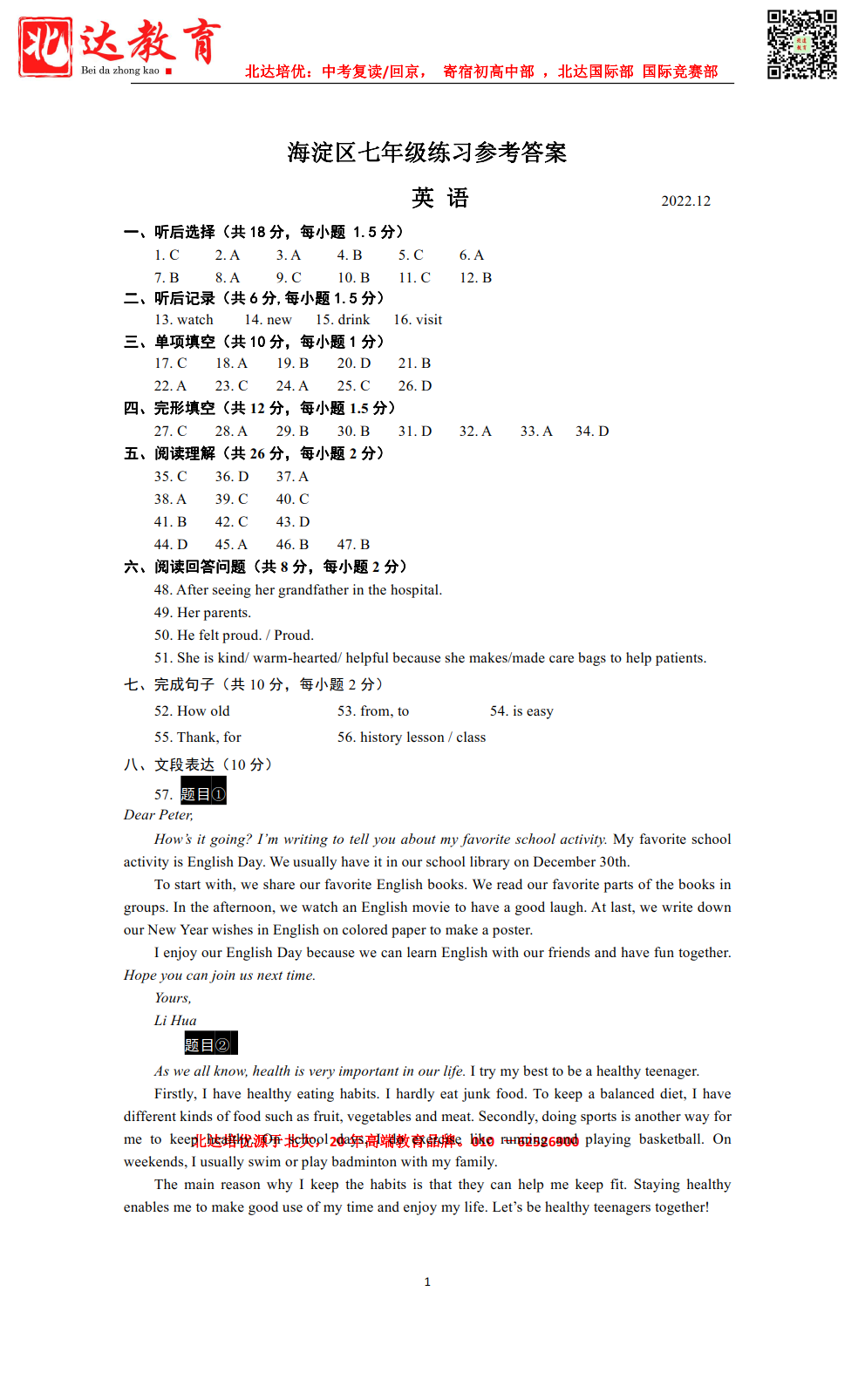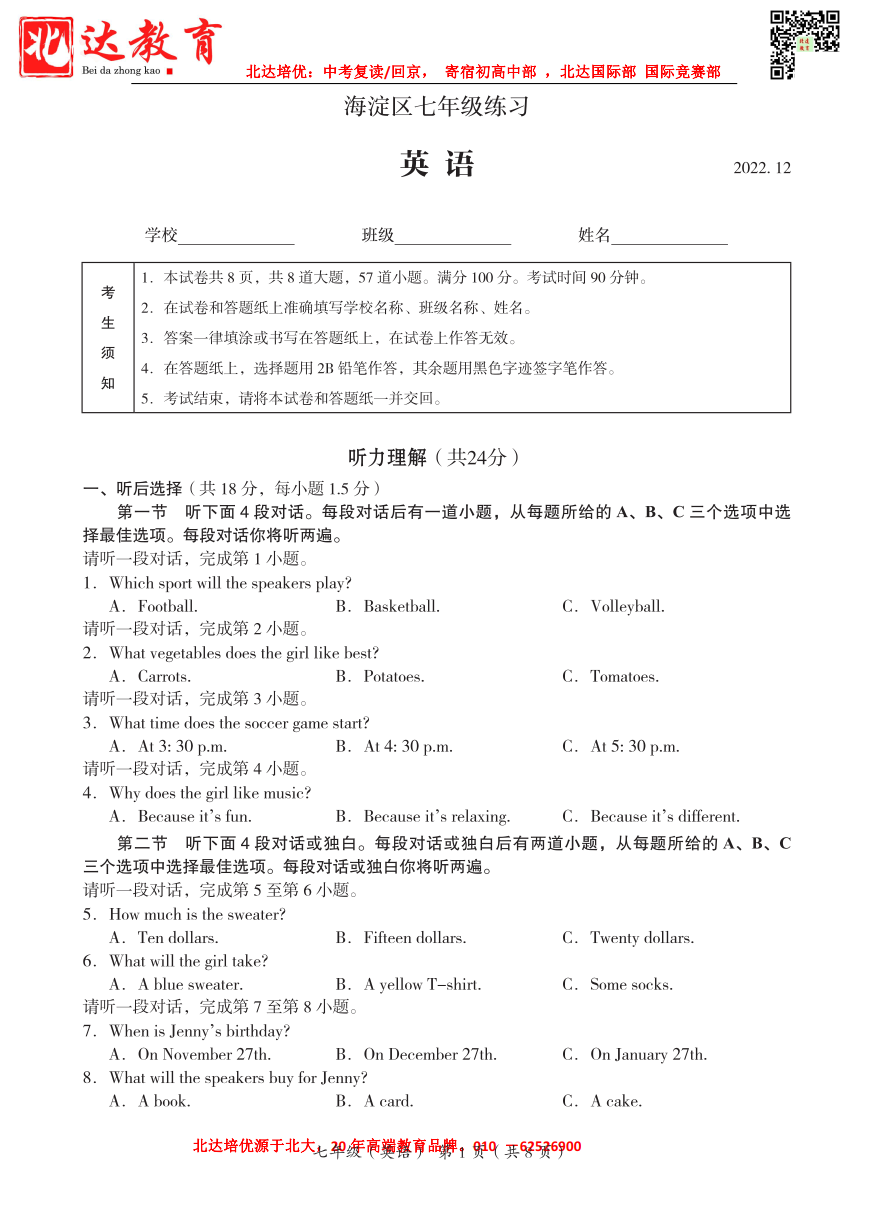 2022-2023学年北京海淀区初一上期末英语试题及答案