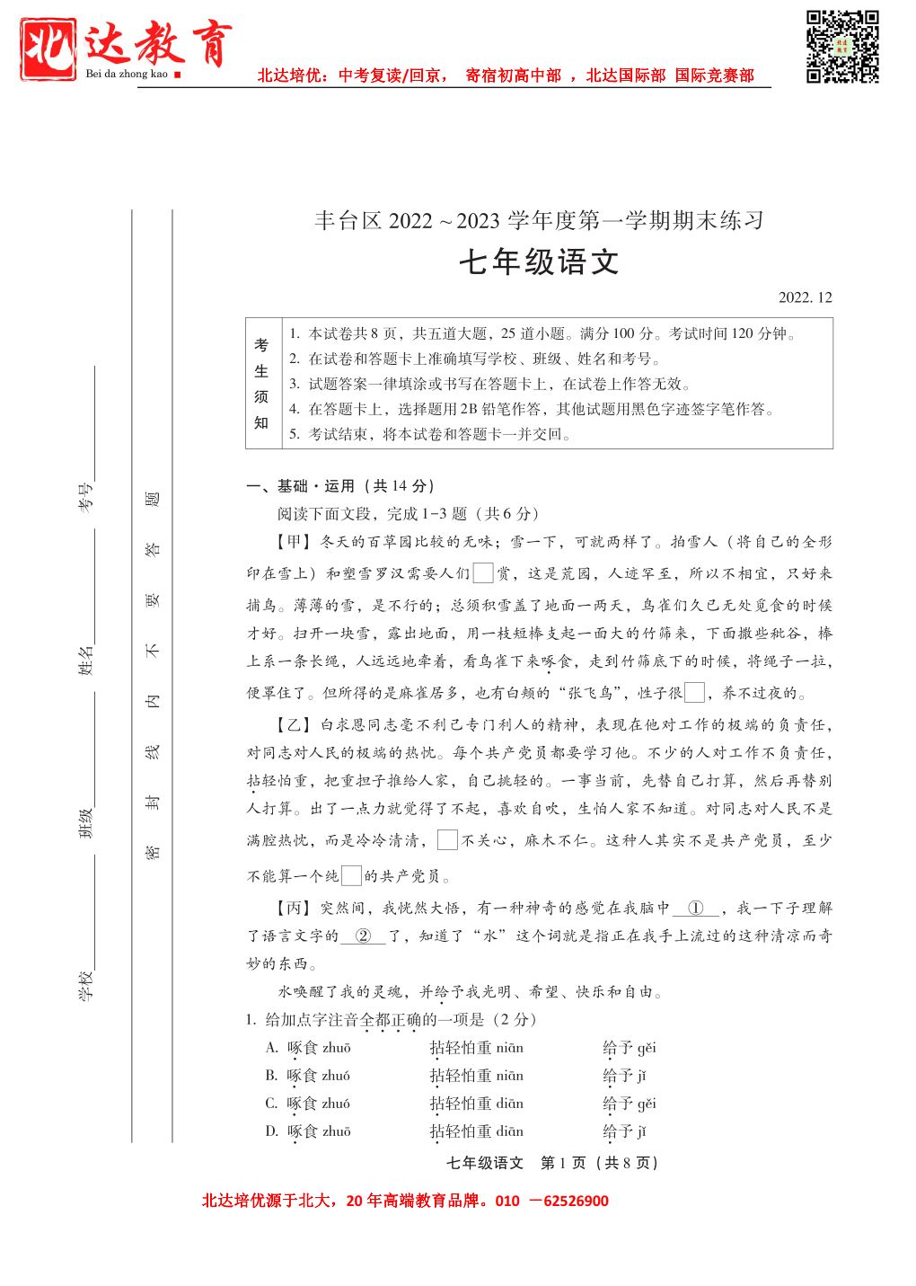 2022-2023学年北京丰台区初一上期末语文考试已结束,admw360中考网第一时间 为大家整理了相关试题及答案,分享给大家。