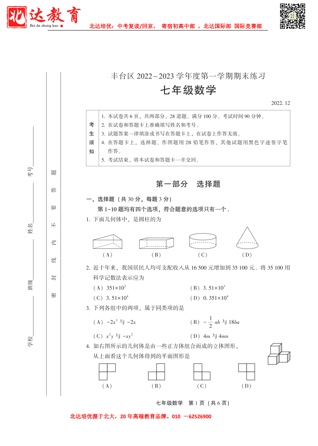 2022-2023学年北京丰台区初一上期末数学考试已结束,admw360中考网第一时间 为大家整理了相关试题及答案,分享给大家。 2022-2023学年北京各区初一(上)期末试卷&答…