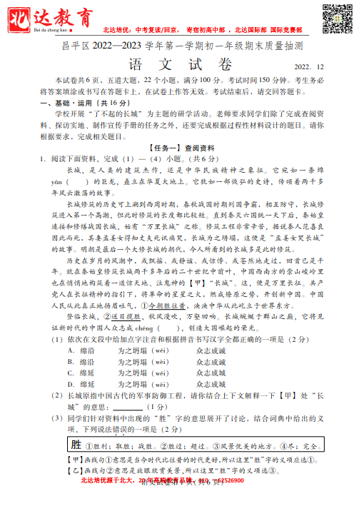 2022-2023学年北京昌平区初一上期末语文考试已结束,admw360中考网第一时间 为大家整理了相关试题及答案,分享给大家。