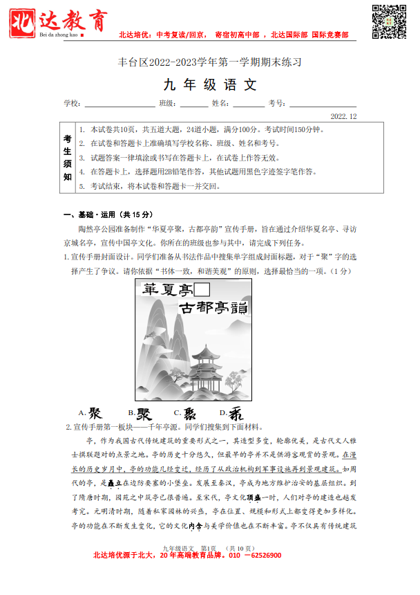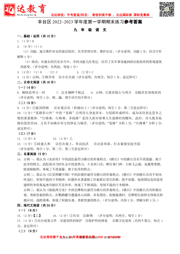 2022-2023学年北京丰台区初三上期末语文考试已结束,admw360中考网第一时间 为大家整理了相关试题及答案,分享给大家。