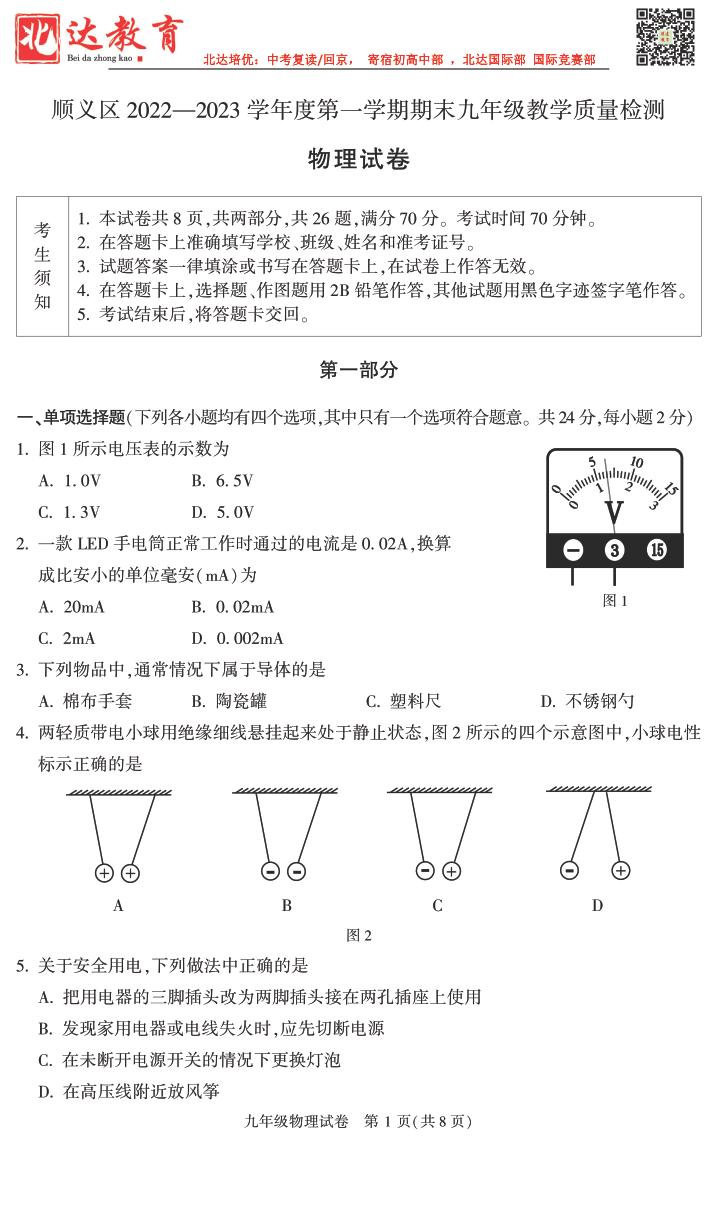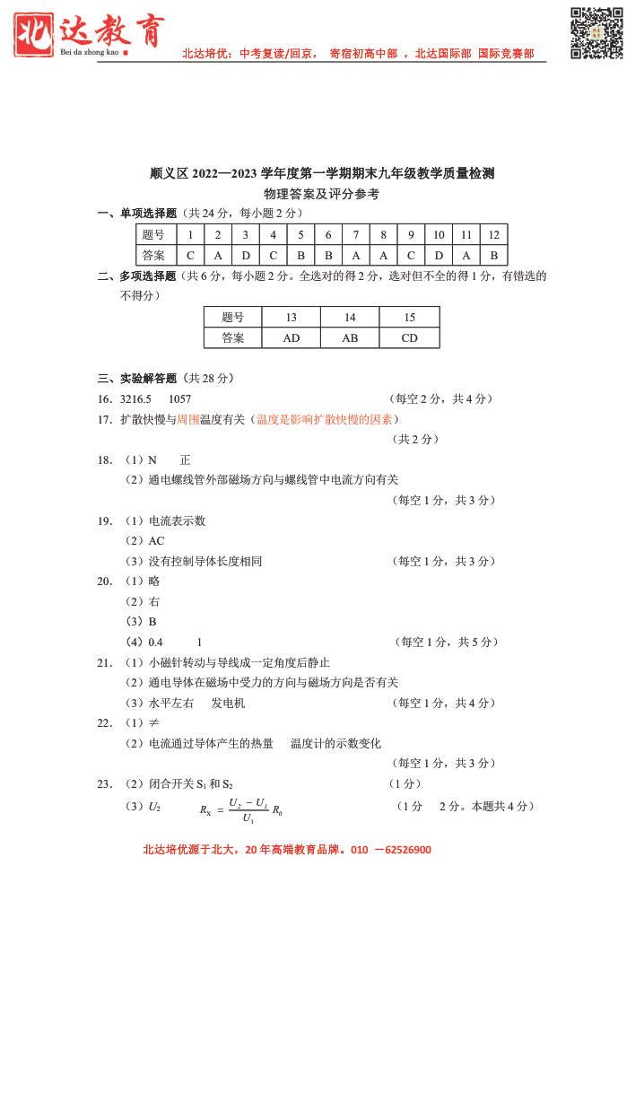 2022-2023学年北京顺义区初三上期末物理考试已结束,admw360中考网第一时间 为大家整理了相关试题及答案,分享给大家。