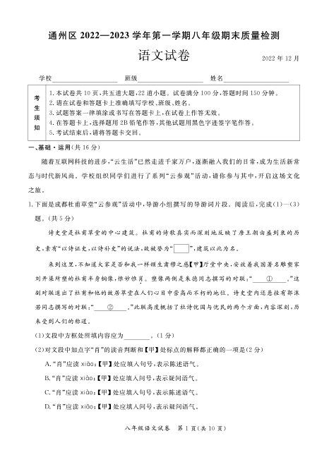 2022-2023学年北京通州区初二上期末语文考试已结束,admw360中考网第一时间 为大家整理了相关试题及答案,分享给大家。